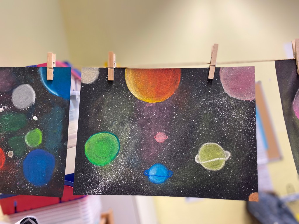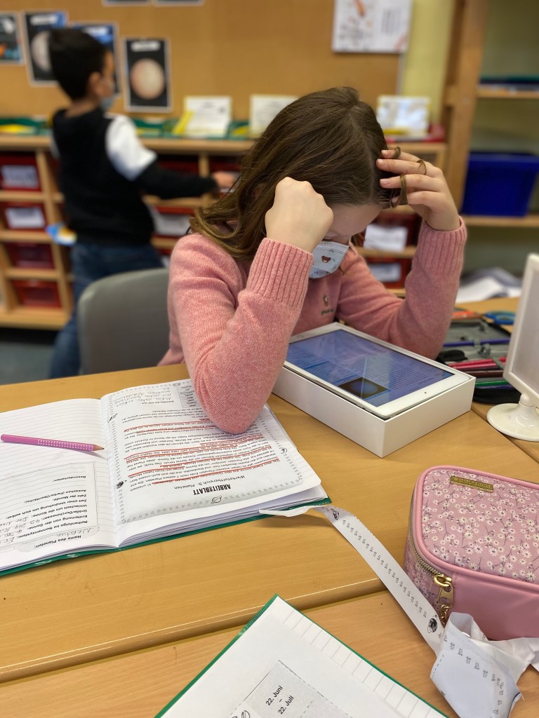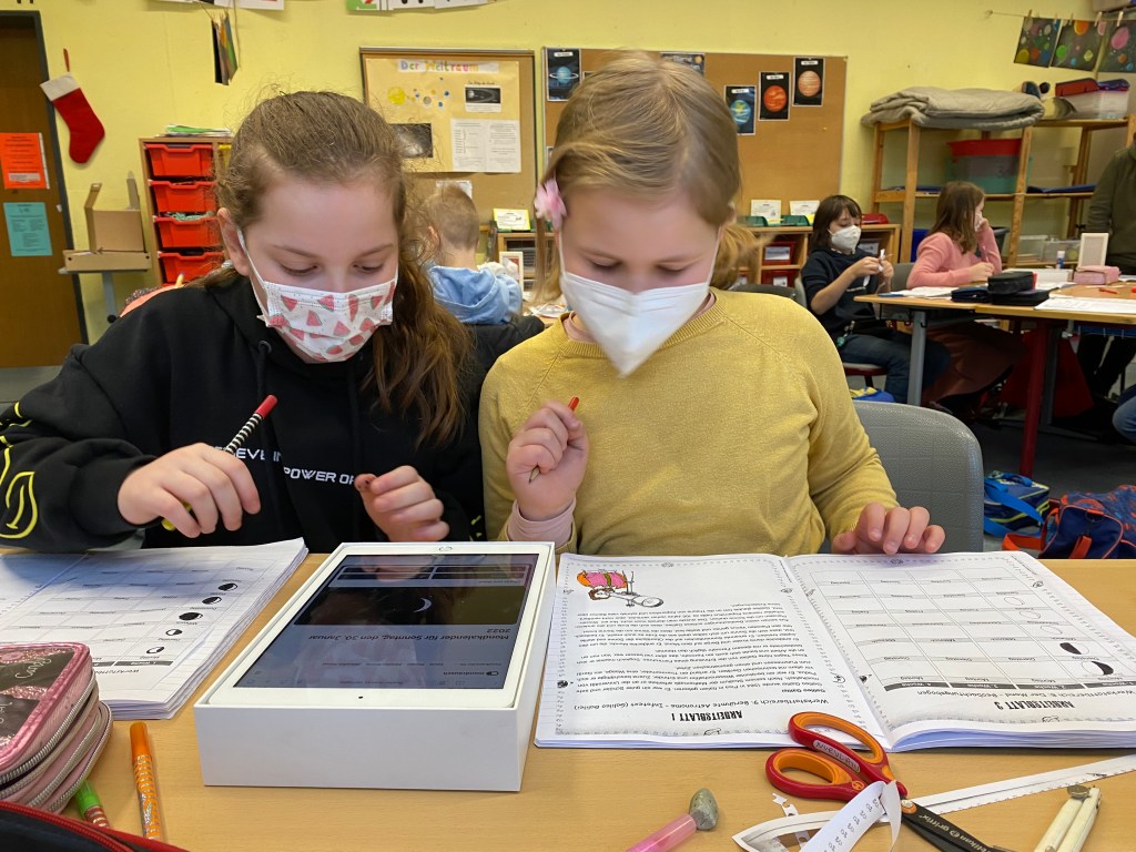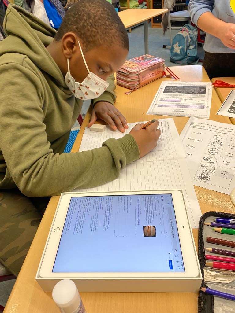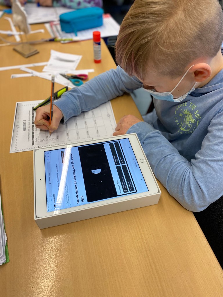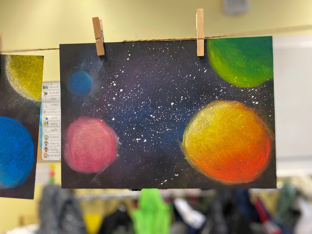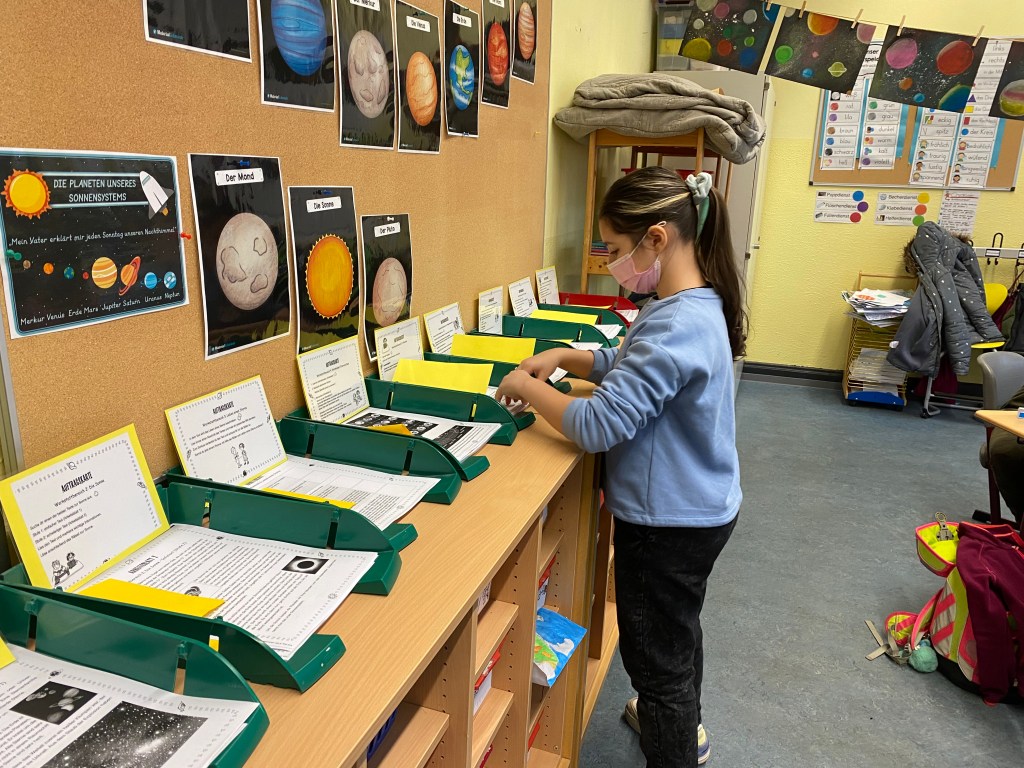 Die vierten Schuljahre beschäftigen sich aktuell mit dem Thema „Weltall“ und haben dazu nicht nur wunderbare Weltallbilder gestaltet , sondern arbeiten mehrmals die Woche an einer Stationsarbeit. Hier müssen die Kinder sich sehr selbstständig Wissen aneignen, im Team forschen und neue Erkenntnisse zu dem Thema sammeln. Die Ipads der Schule, Bücher zu dem Thema und weiteres Informationsmaterial sind gute Quellen, welche die Kinder stark motivieren und ihre Selbstständigkeit fördern.
